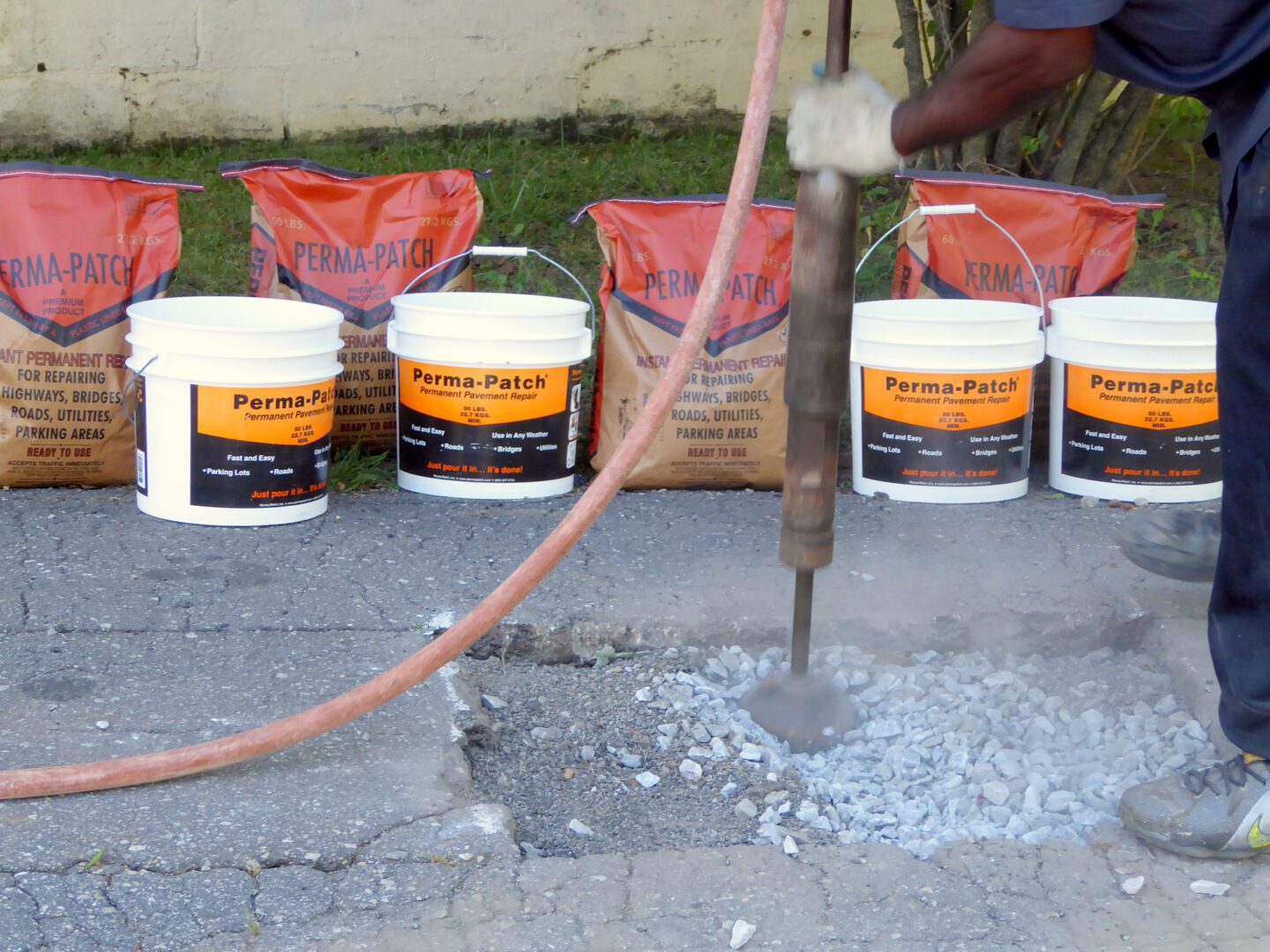 - No heavy equipment, dump trucks, or large crews are necessary when using Perma-Patch. However, all are required for the placement of hot mix asphalt. Perma-Patch can be poured directly from the bag into the pothole or utility cut. Additionally, Perma-Patch repairs accept traffic immediately and can be compacted by the weight of the traffic. For better appearing repairs, or for repairs of lightly traveled areas, vibratory plate compactors or hand tampers may be used.